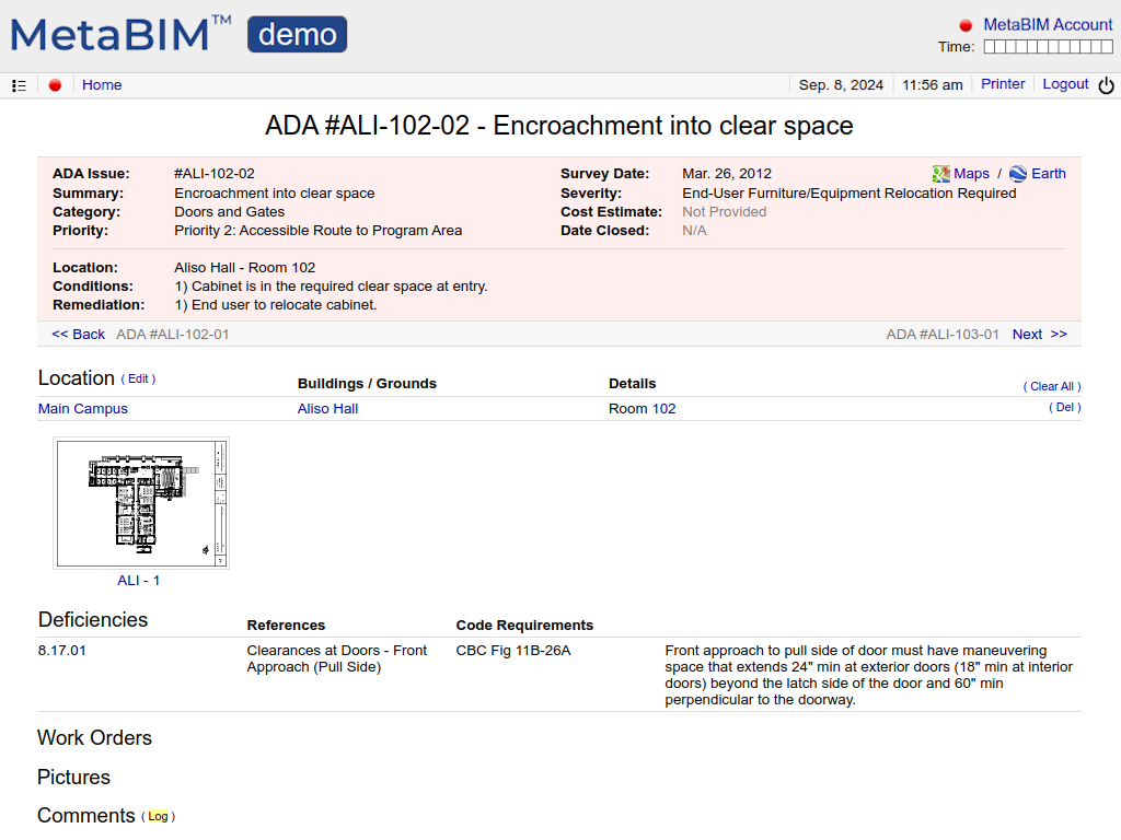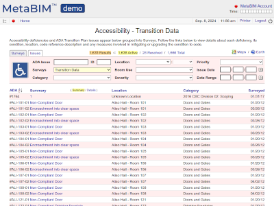 ADA deficiencies, indoor / outdoor locations, feasibility, cost, documentation on progress. |