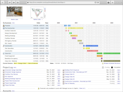 Project portfolio, parties, budget, funding, schedules, key events, contracts, invoices. |