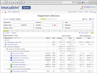 Divisions, departments, units, staffing, space assignments, equipment, service requests. |