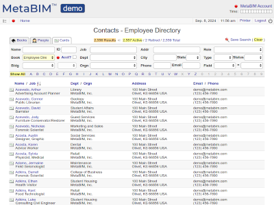 Employees, job titles, contacts, timekeeping, occupancy, teaching, awards, assignments |