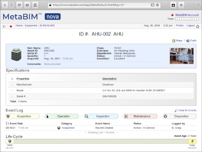 Asset photos, specs, locations, custody, event logs, inspections and maintenance histories |