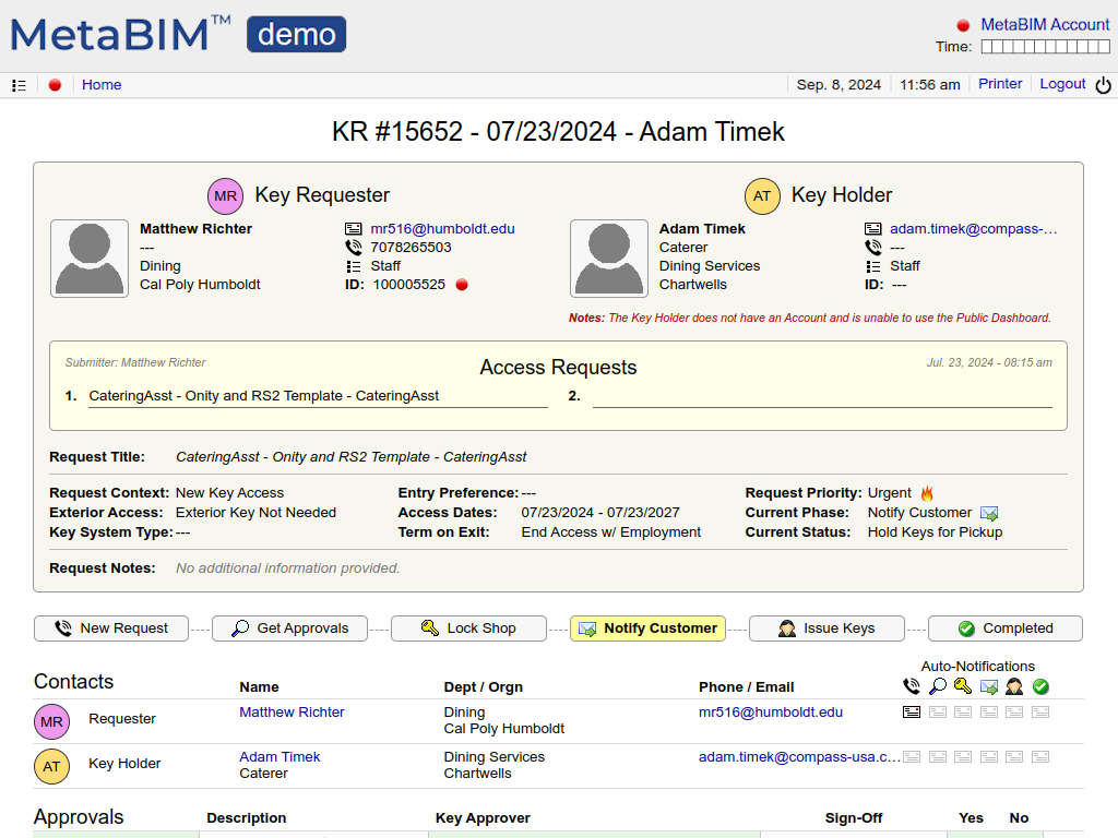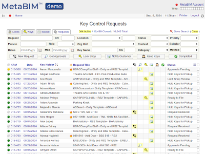 Locks, keys, issuances, access requests, key holders, approvals, notifications, histories. |