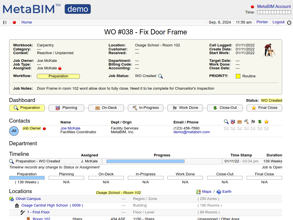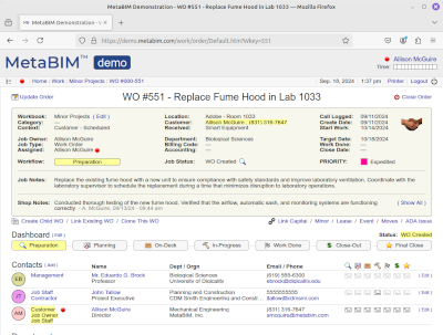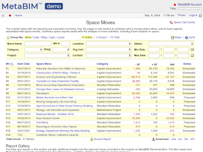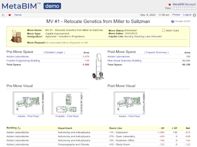 Space moves, people, locations, destinations, furniture, scheduling, impacts, work orders. |