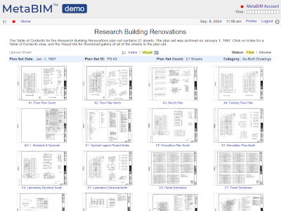 Searchable archive of large format A/E/C drawings, indexed by location and project. |