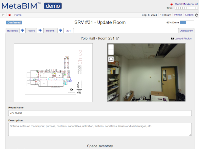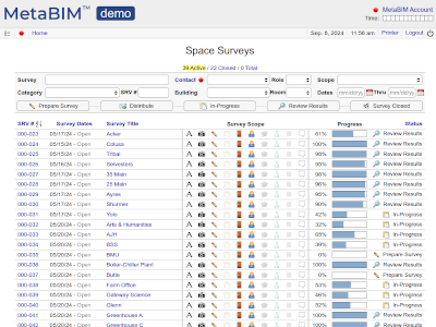 Space surveys, respondents, photos, notes, checklists, occupancy, equipment custody. |