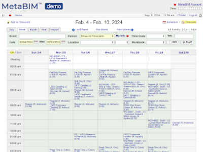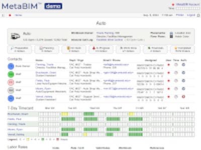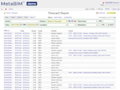 Timecard, staffing, hours worked, time codes, absences, work orders, labor rates, expensing. |