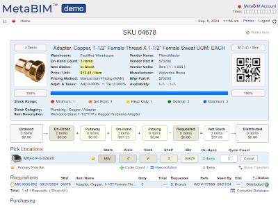 Material requests, stock level, pricing, picking, distribution, reorders, put-away, cycle counts. |